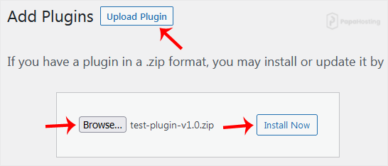 3. Haga clic en Cargar complemento y luego en Explorar. Elija el archivo zip de su complemento y haga clic Instalar ahora.