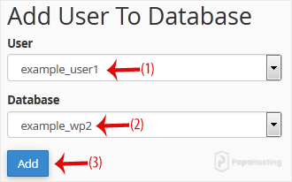 3. Desplácese hacia abajo hasta el final de la página y hacia abajo Agregar usuario a la base de datos. Seleccione un usuario de la lista desplegable y elija una base de datos de la lista.