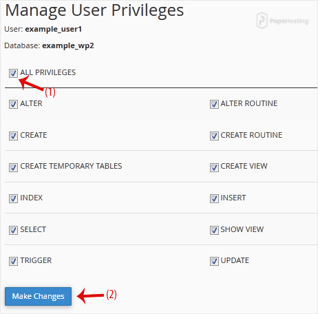 5. En Administrar privilegios de usuario. Marca la caja TODOS LOS PRIVILEGIOS y haga clic en Realizar cambios.