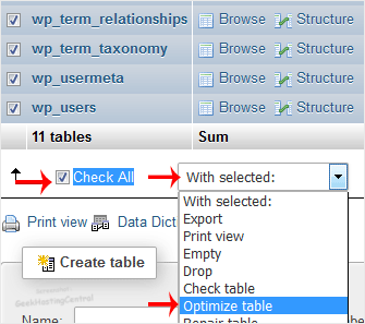 4. Desplácese hacia abajo y marque Verificar todo. Haga clic en la opción desplegable y seleccione Optimizar tablas.