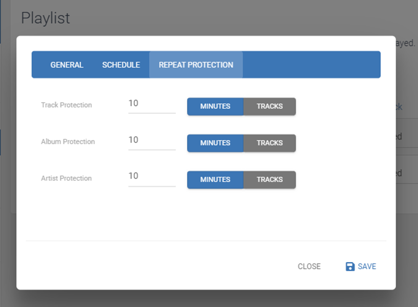 Repeat Protection garantiza que la misma pista, o una pista del mismo álbum o artista, no se reproduzca dentro del período definido, o dentro de una cierta cantidad de reproducciones de pistas.